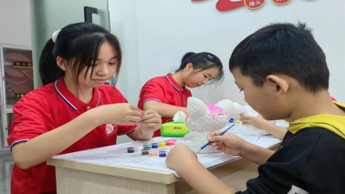 红医卓越班成员与社区儿童一起涂石膏娃娃 谢邦盛摄