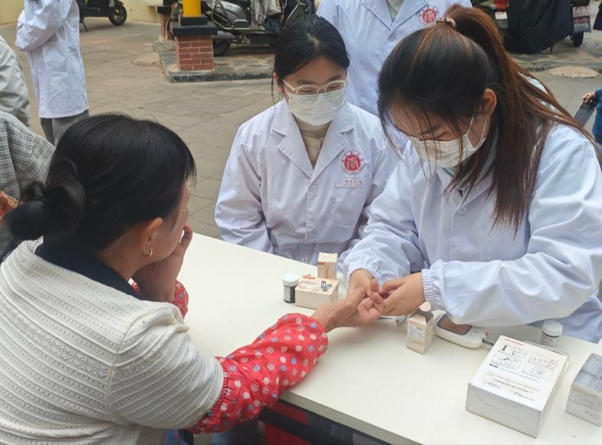 活动筹备阶段,志愿者们积极对接社区居委会,深入调研居民健康需求,精心准备了血压计、血糖仪及各类健康宣教资料。活动现场,志愿者们分工协作,高效有序地为社区长者提供血压测量、血糖检测服务,并耐心细致地讲解健康保健知识与科学用药方法。同时,志愿者们还贴心指导老人使用智能手机等设备,助力跨越“数字鸿沟”。活动亦关照社区儿童,普及基础健康知识,通过趣味互动传递关爱,营造出温馨和谐的社区氛围。
