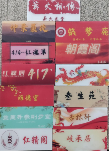 本次活动共征集到13件极具特色的寝室门牌,均是以红色文化为背景,结合班级特色和寝室文化,用不同的表现形式展现我院青年爱祖国、爱医学的情怀。采用简洁明了的线条和图形设计的简约风门牌,体现清晰易读性;结合红色文化和班级特色,运用艺术手法设计的艺术风门牌,使门牌更具艺术感和审美价值;以当下热点为主线,设计的独特性创意风门牌,展现班级的个性和活力。